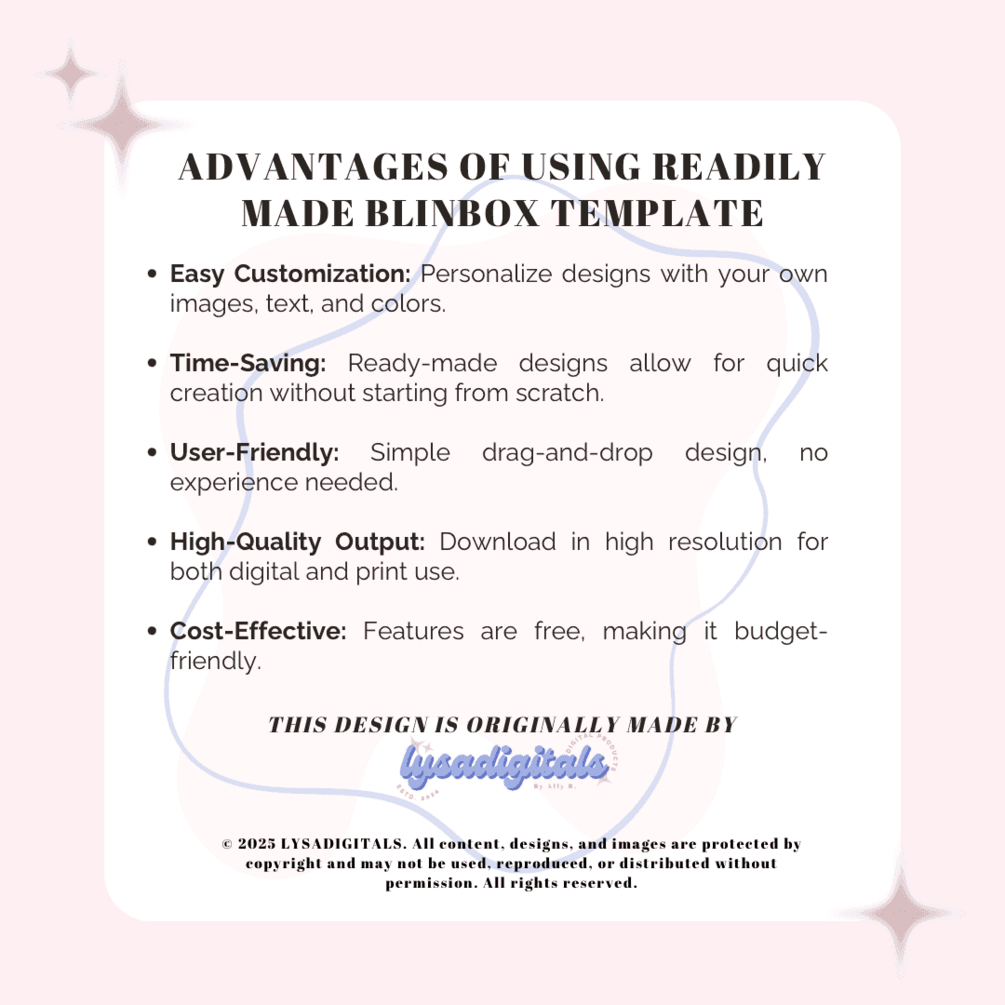 1. BlindBox Template: A fully customizable template in Canva that allows you to create the perfect design for your BlindBox. With an easy drag-and-drop interface, you can tailor it to your brand, event, or personal style.